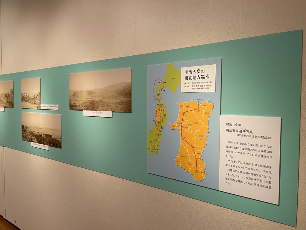 同展は「皇室ゆかりの江戸美術」「近代絵画の名品」「平福百穂と金鈴社」「秋田ゆかりの美術工芸品」「近代日本工芸の精華」の5つの章で構成し、秋田出身の日本画家・平福穂庵(すいあん)や平福百穂(ひゃくすい)、寺崎廣業などの秋田にゆかりある日本画や、帯状の銀線を立てて、色の境目を区切る有線七宝の技術で作られた菓子入れ「ボンボニエール」など、55点を展示する。明治天皇が、東北巡幸で秋田を訪れた際に大蔵省印刷局が撮影した写真パネルなども展示する。