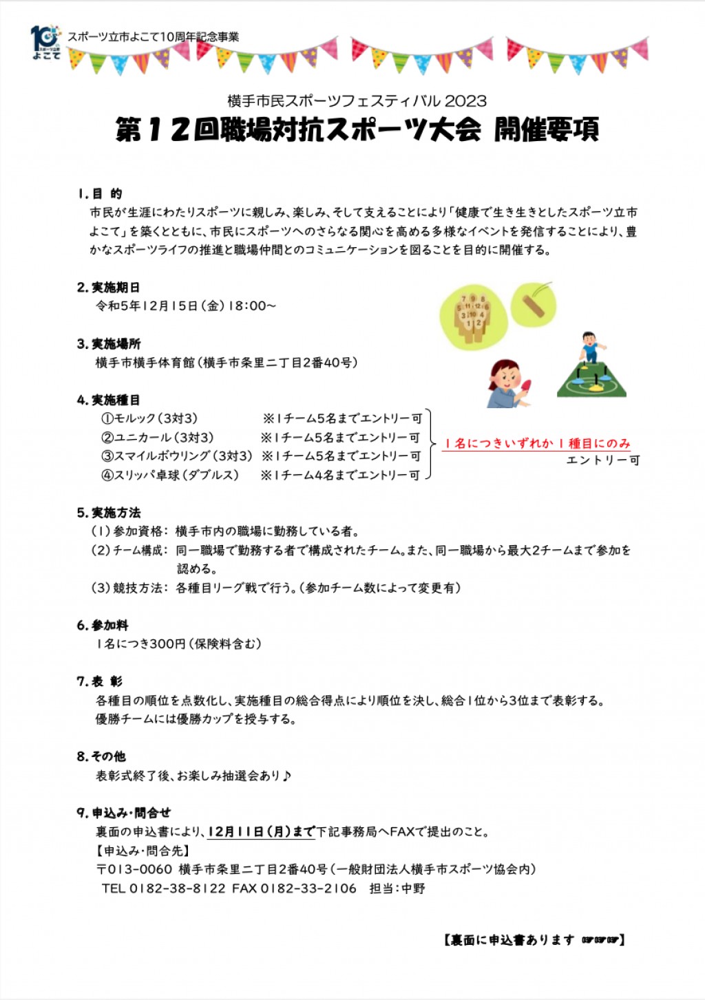 | お申込み・お問合せ | 一般財団法人横手市スポーツ協会 中野さん TEL:0182-38-8122、FAX:0182-33-2106 |