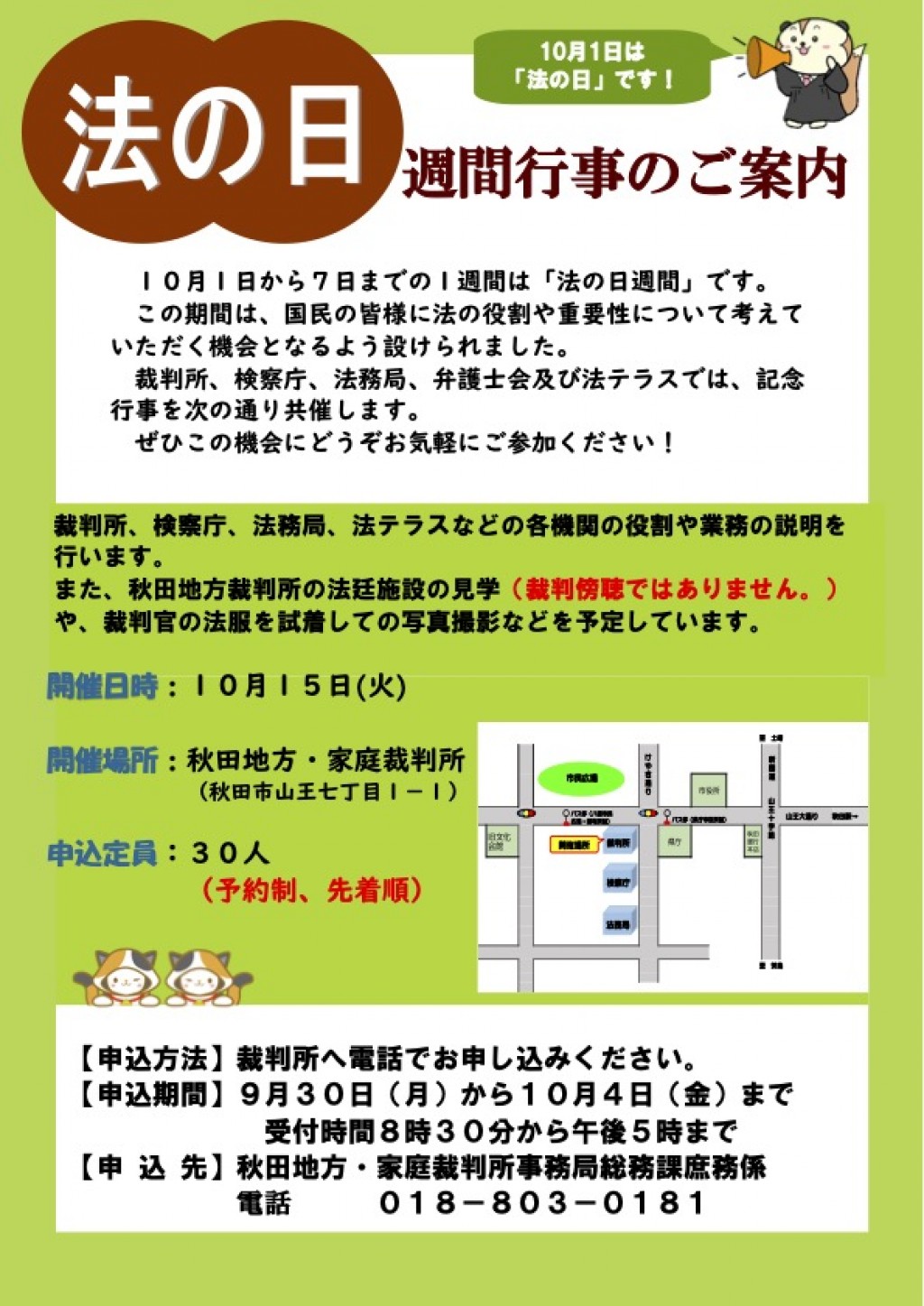 | お申込み・お問合せ | 秋田地方・家庭裁判所総務課庶務係 018-803-0181 |