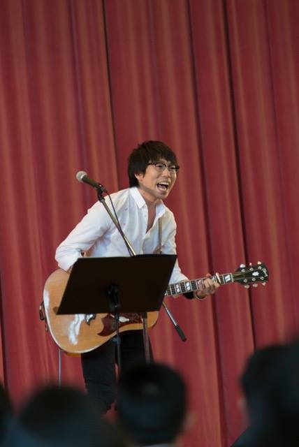 卒業証書授与式の閉会の挨拶の直後に校長先生から「山内中学校の先輩、高橋優先輩が来ています!」の合図とともに、緞帳が開き、高橋優さんが登場!