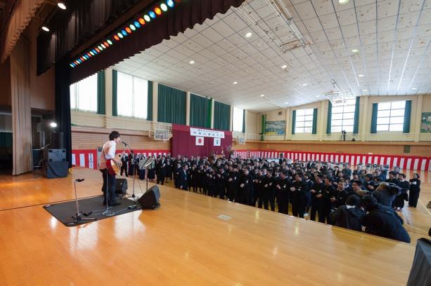 「1番最初にステージに立ったのは、実はこのステージで、バンド演奏でGLAYの「SOUL LOVE」をやりました!、ここ山内中学校で過ごした記憶は一生消えないし、過ごした絆も一生消えない。これらは新しい一歩を踏み出すときの勇気になります」 と思い出のステージから生徒にメッセージを送りました。