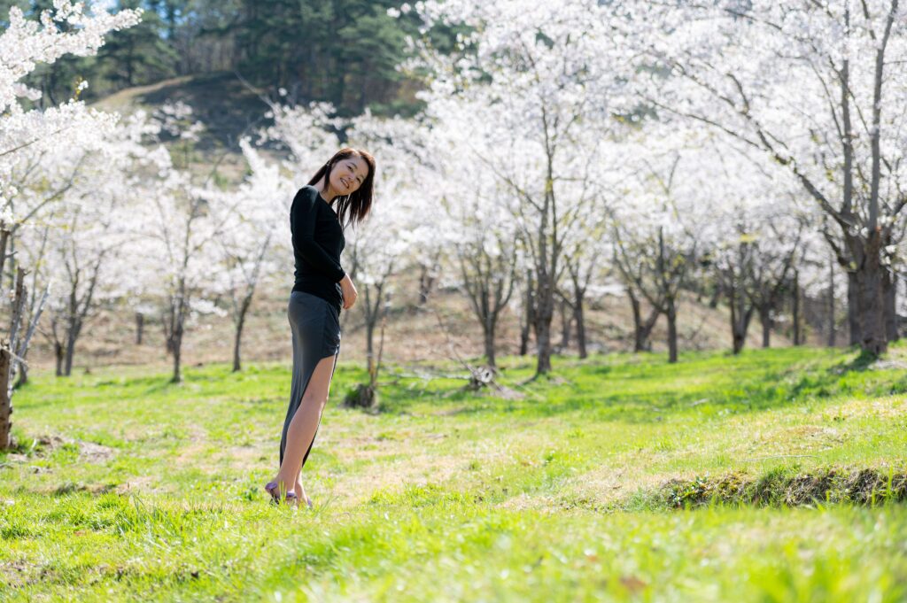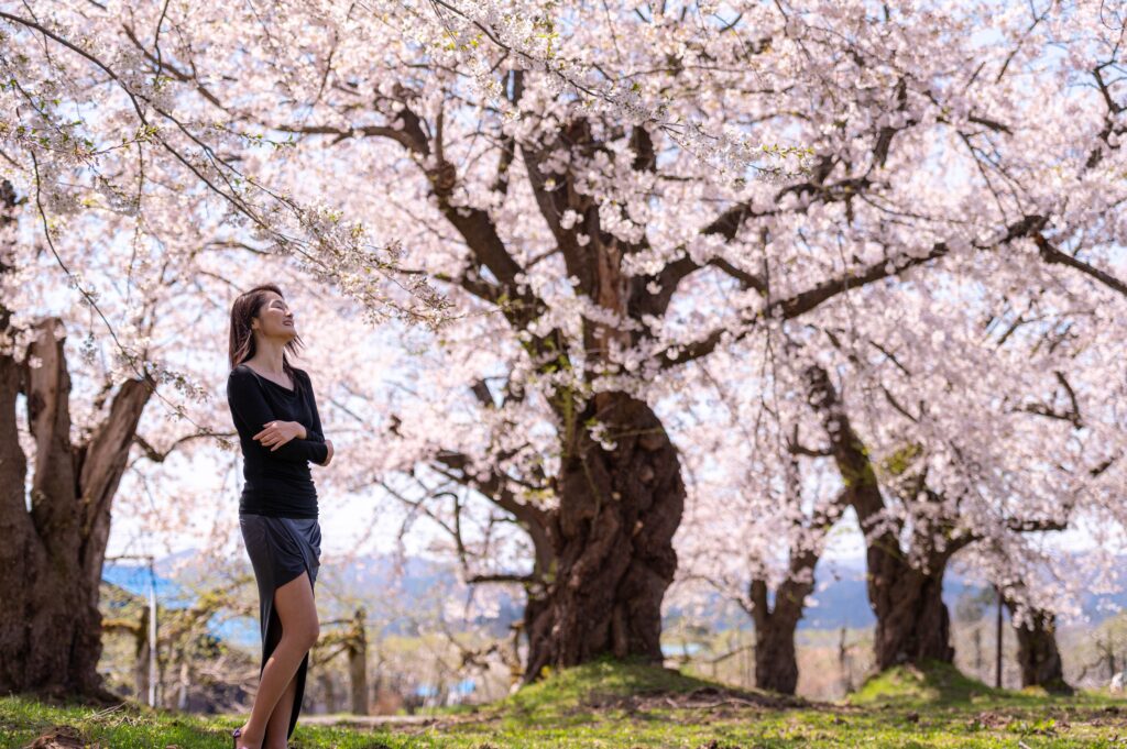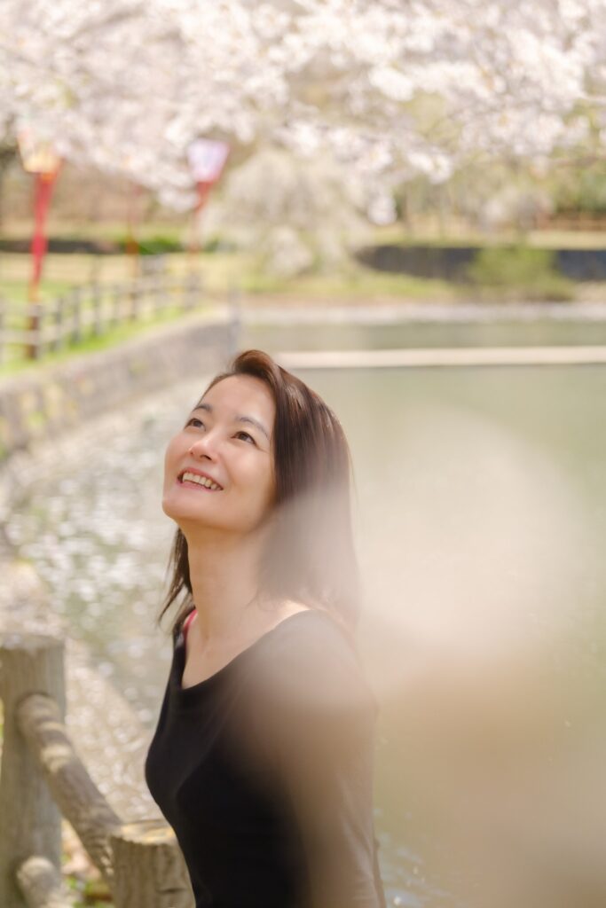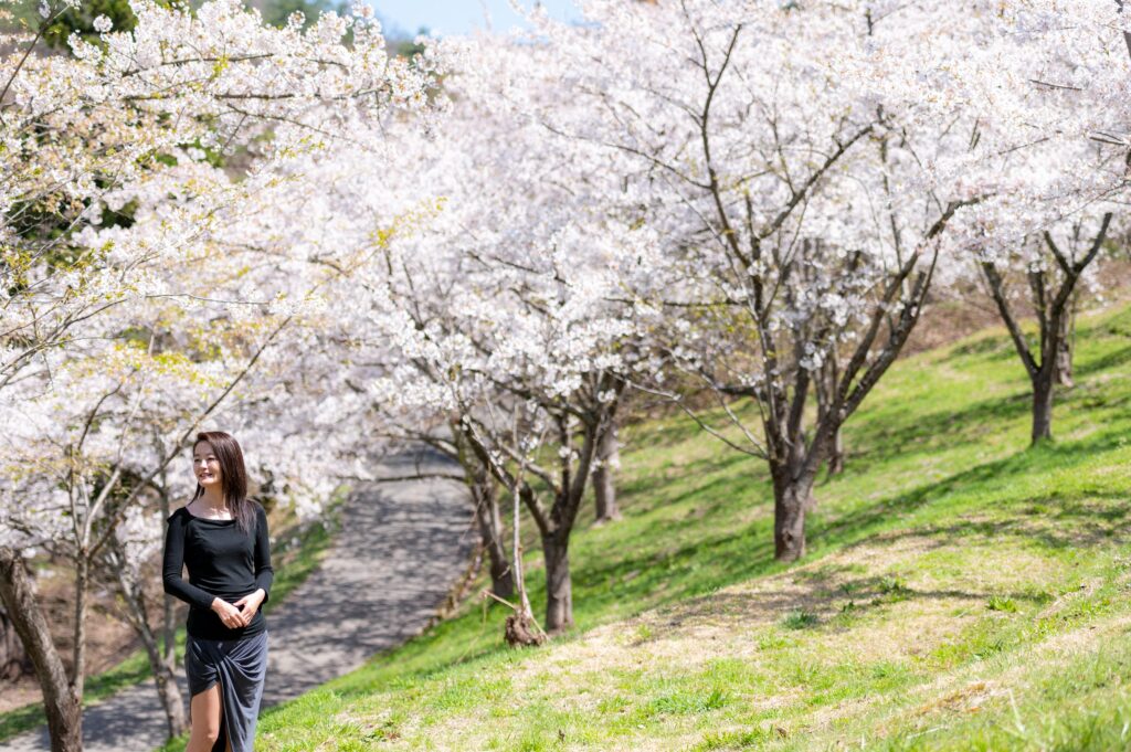奥まで桜が植っているので、下から撮ると上半身全ての背景を桜にすることができました。