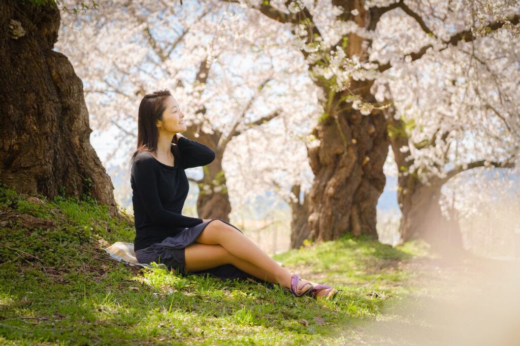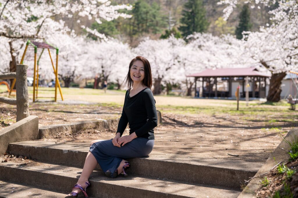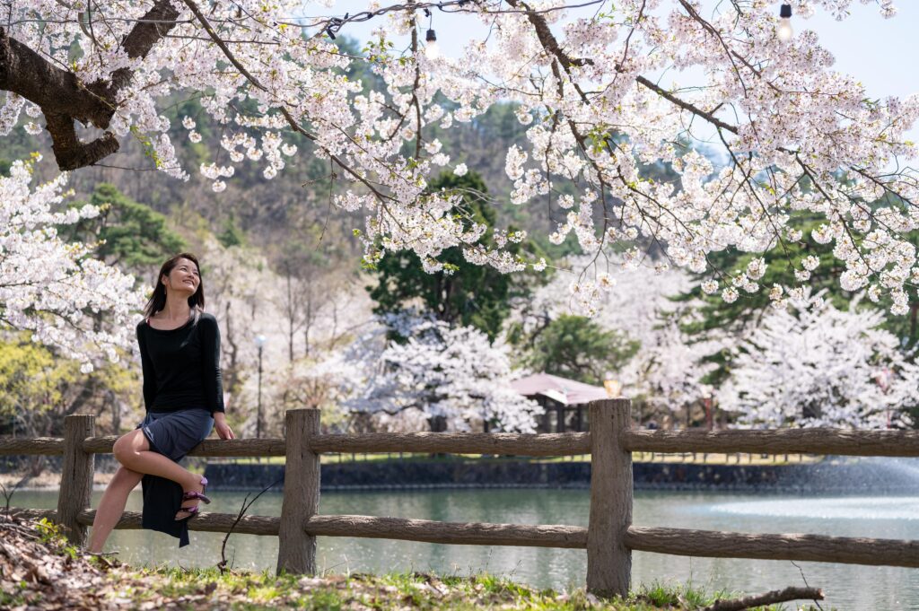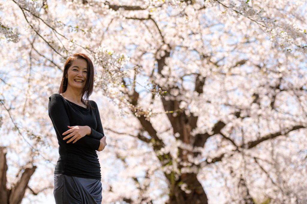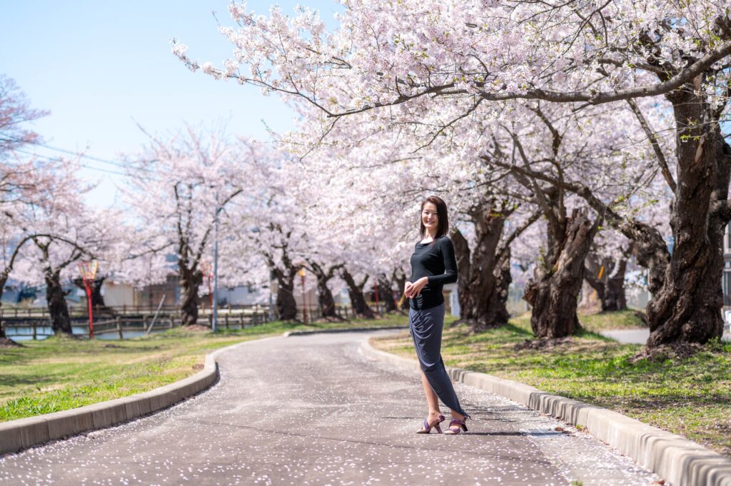奥まで桜が植っているので、下から撮ると上半身全ての背景を桜にすることができました。