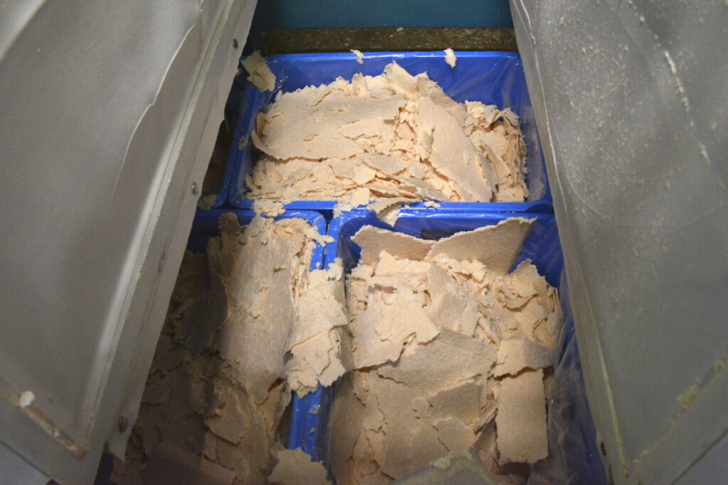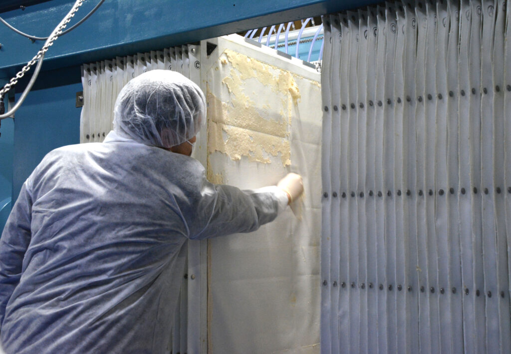 圧搾機の白い布の裏表にはびっしり酒粕がついています。これを剥がして取り除く作業です。