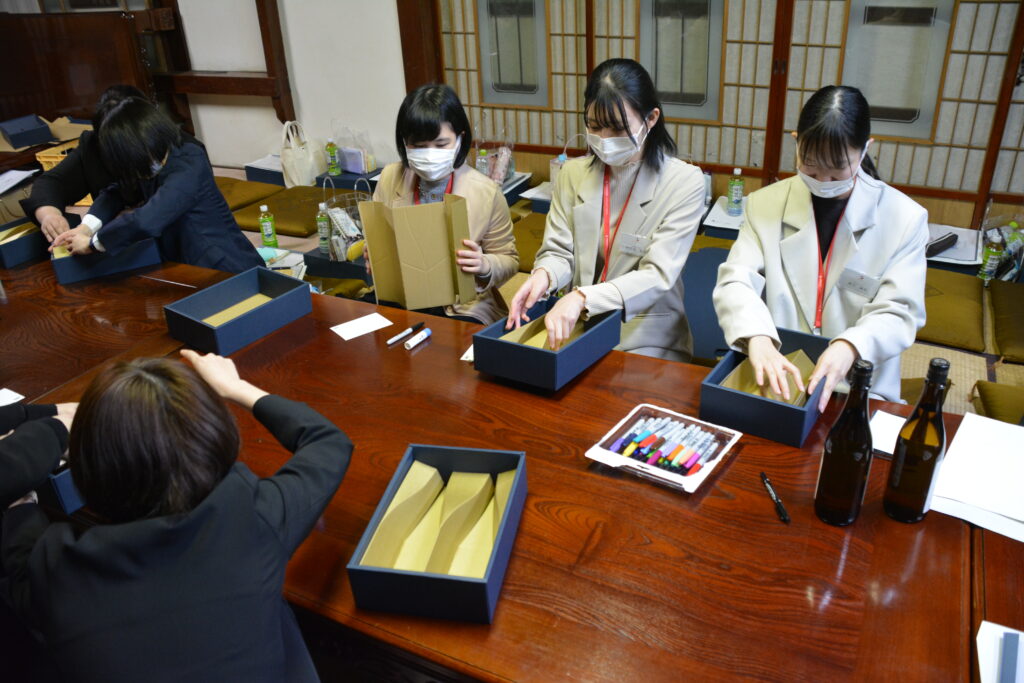研修内容は仕込体験・蔵見学と、瓶のラベル作り・贈答用の箱作り。