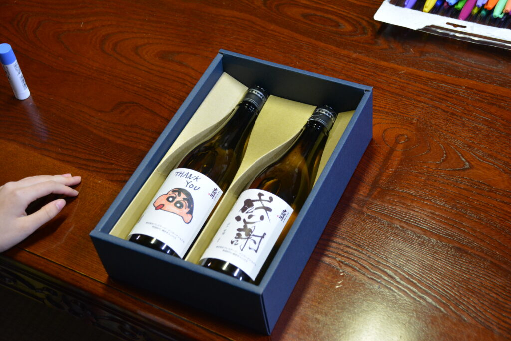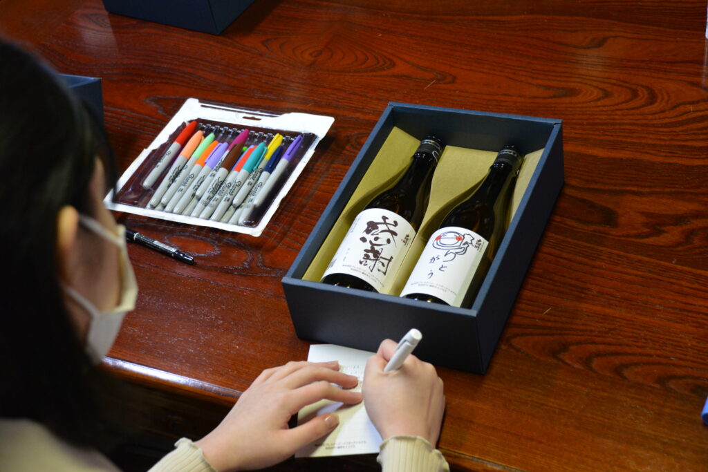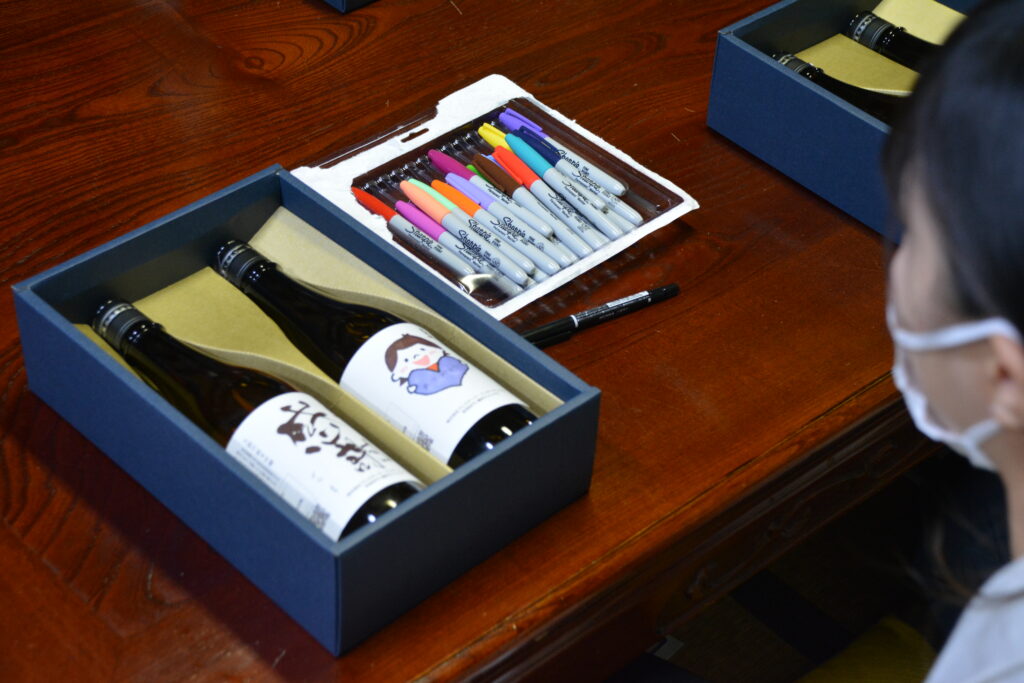 作成したラベルは純米酒と純米吟醸酒の2本に貼り、各々が持ち帰ります。