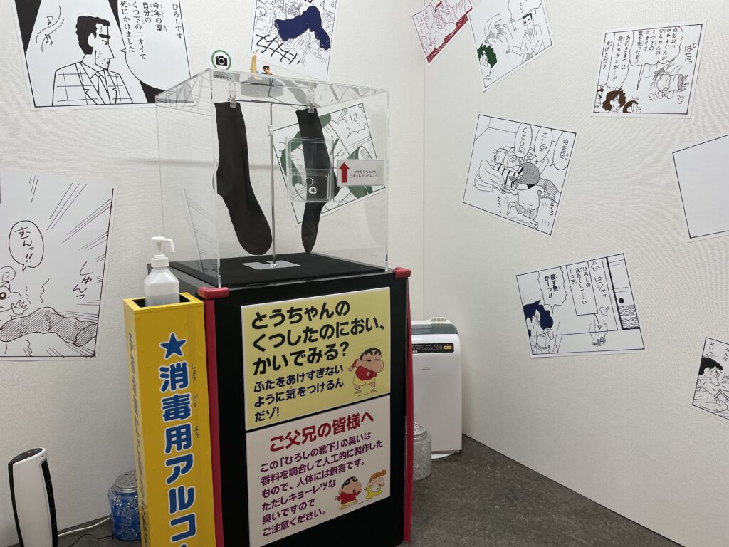 会場の一角に区切られているスペースが。透明なBOXの中に靴下が吊られていて、その周りにはこれでもかという程の消臭剤と空気清浄機_( ̄ー ̄ )