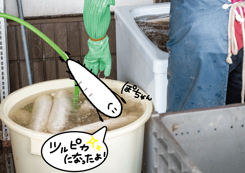 専用の機械を通るとドロドロだった大根がとゅるん!と白い大根になります。