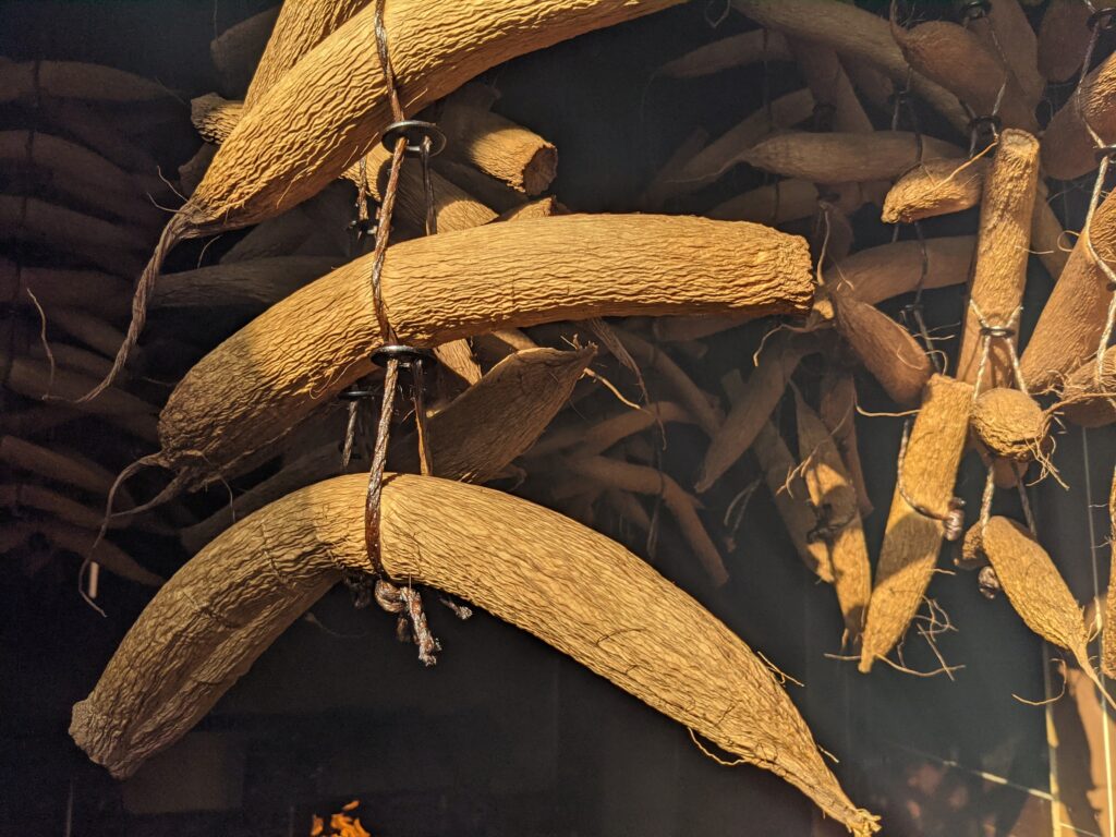 吊るし方は様々あるようですが、ここでは縄に金具で出来た丸い支えが通されていて、縄1本に対して大根を7本吊るすようになっていました。