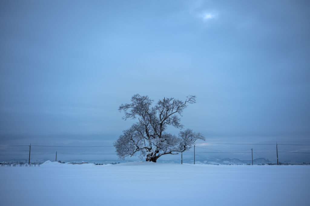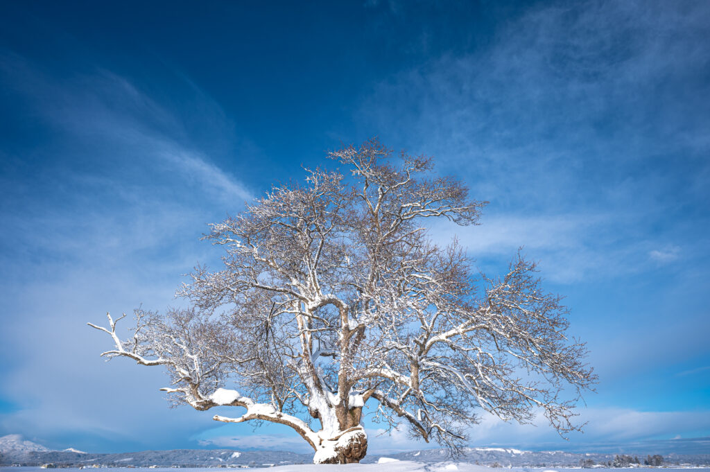 雪原の真ん中に、空を抱くように力強く伸びる鹿嶋梨。
