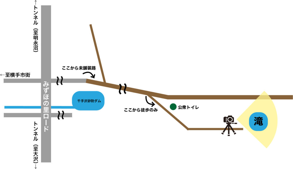 住宅街の奥へ続く道をさらに山奥まで進み、続く険しい道のその先にある滝ノ沢という場所にある滝です。