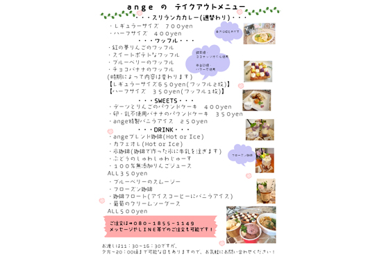営業時間:11時半〜16時半(テイクアウトは営業時間外と可能。注文は営業時間内でお願いします)