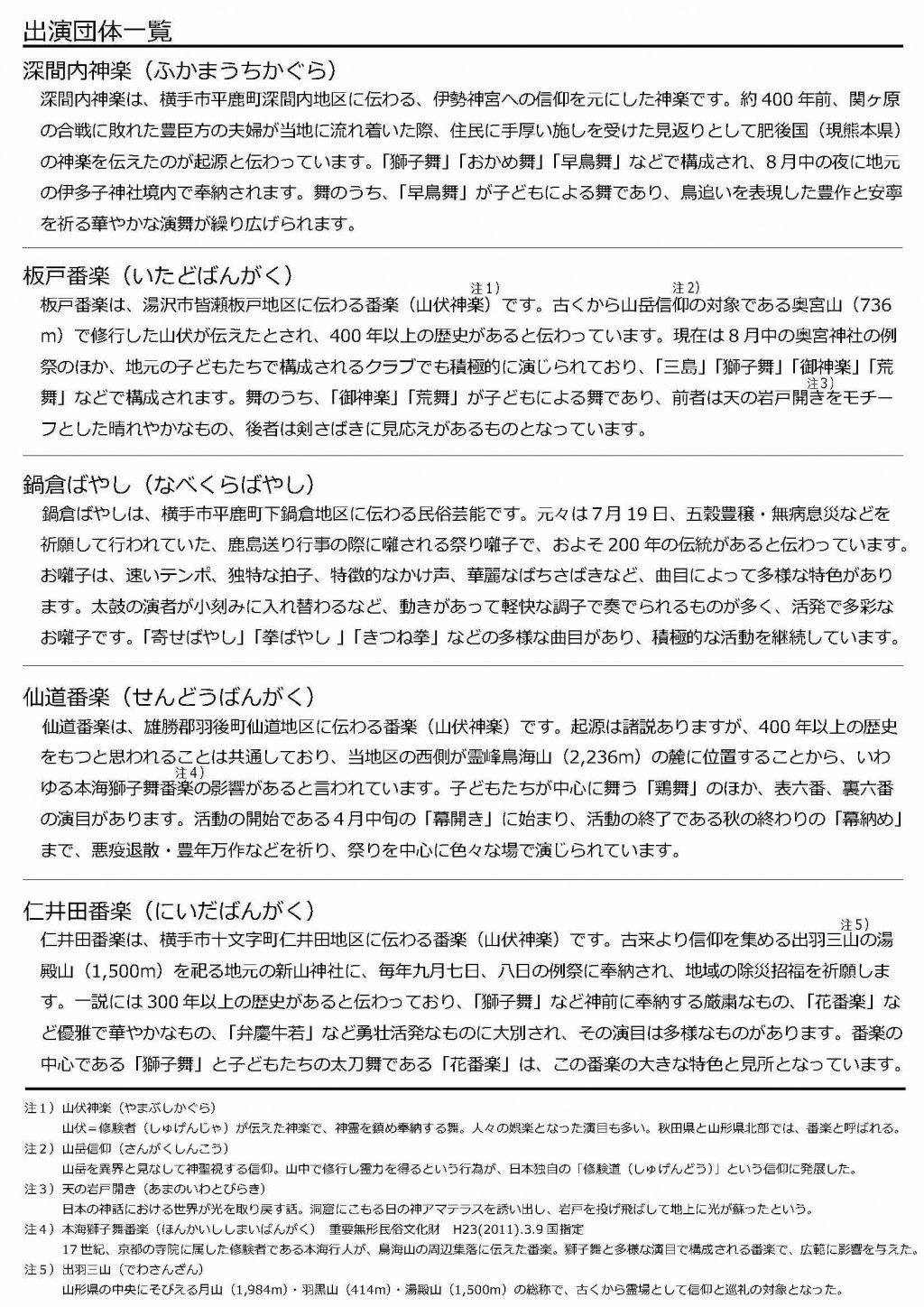 出演:深間内神楽保存会・鍋倉囃子保存会・仁井田番楽保存会を含む5団体