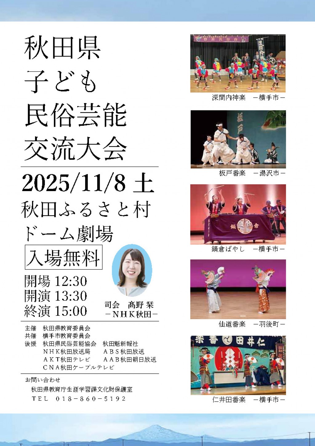 3回目となる今大会は、横手市で開催し、県南部に所在する5つの民俗芸能を披露します。